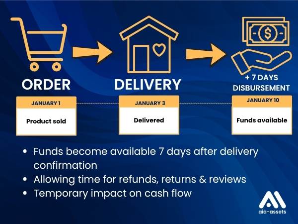 Because payouts are delayed, you may need to shift inventory planning: pre-stock more safely ahead of restock lead times rather than relying on fast cash turnover.