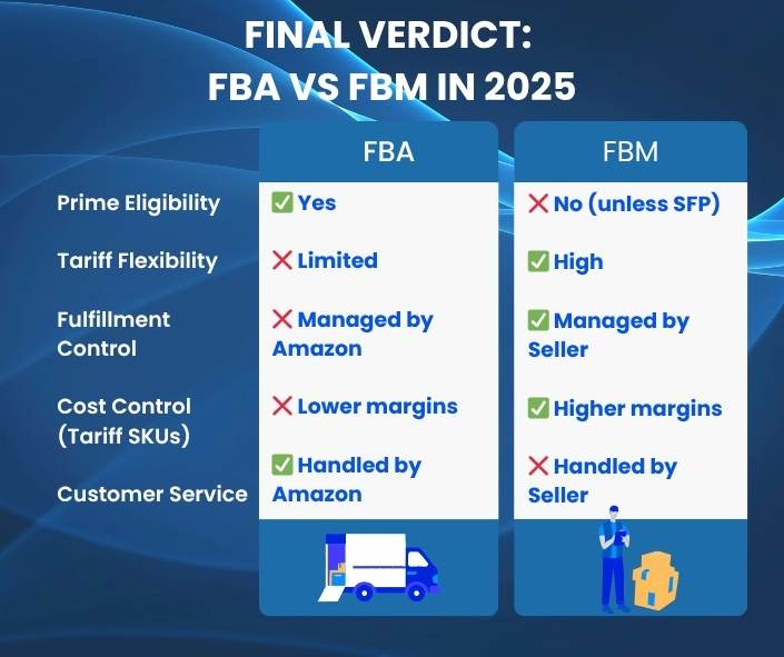 In a tariff-heavy year like 2025, FBM offers sellers more flexibility, better cost control, and faster adaptation to sourcing challenges. However, FBA still wins for convenience, customer trust, and Prime traffic—especially on fast-moving items not impacted by new import duties.