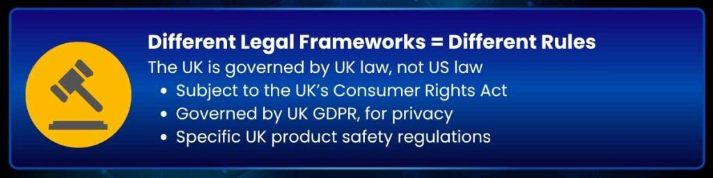 Regulations around product safety, labeling, and returns are specific to the UK and enforced aggressively by local authorities