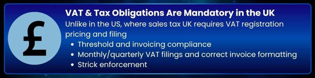 Unlike in the US, where sales tax is handled on a state-by-state basis, the UK requires: