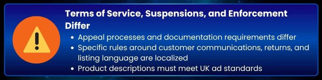 So while Amazon US may permit a certain product listing or return policy, that same product might be non-compliant or restricted in the UK.