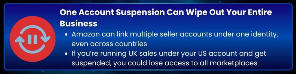 So if you’re running UK sales under your US account and get suspended in one region, you could lose access to all marketplaces globally.